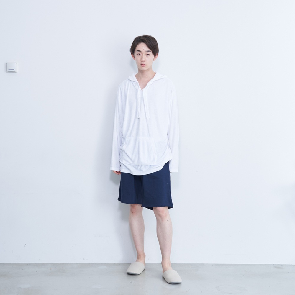 胸元が大きく開いているのも普通のパーカーと違うところ。レイヤードにもなかなか使えるアイテムです。