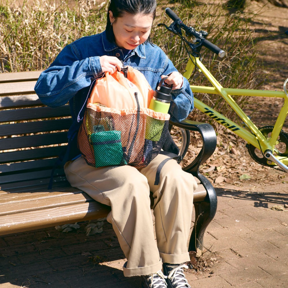 デザインアクセントとなっているメッシュのアウトポケットは、すぐ取り出したいものの収納やタオルや着替え等 濡れたものの収納にもおすすめです。