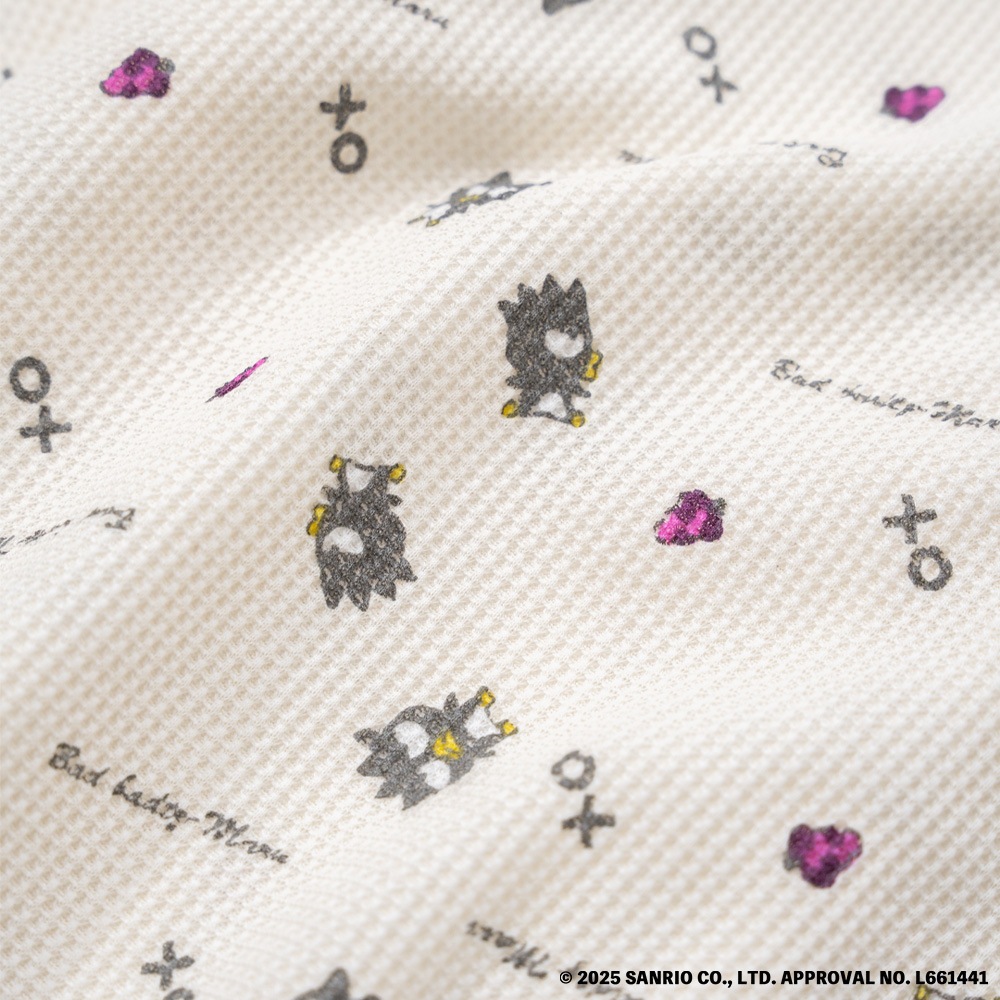 ハローキティ、タキシードサム、ポチャッコ、バッドばつ丸の4キャラクターとフルーツ柄を組み合わせたオリジナルの総柄プリントが特徴。