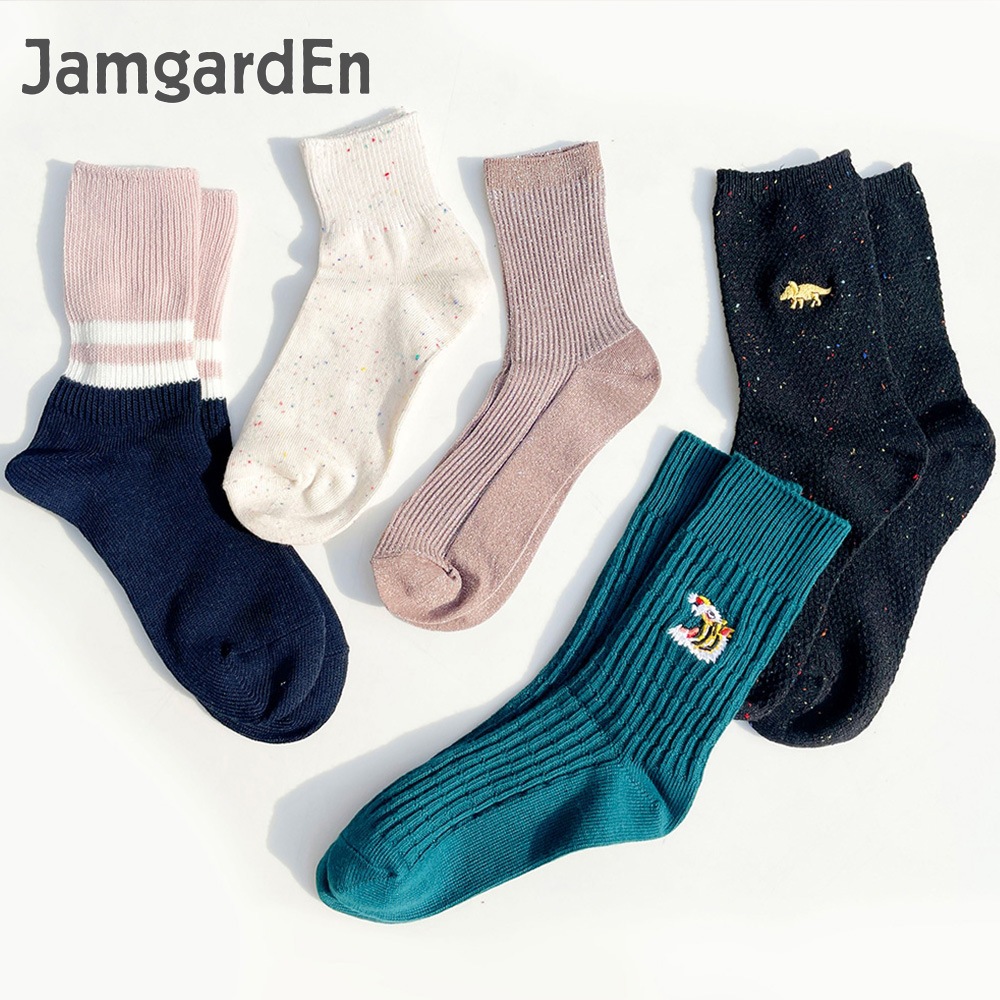 Jamgardenのベーシックライン、アクセントになるカラー物や柄物、人気のワンポイント刺繍などの靴下が入っているバリエーション豊富な5足セット。