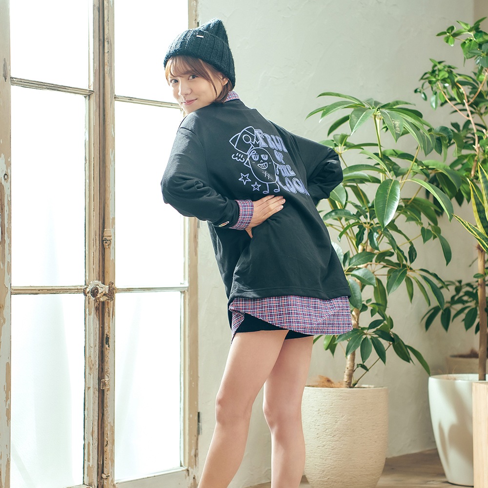 松永さんが提案したポップでキュートなイラストがアクセントにトップスだけで外出できたり外でも室内でも使用できる魅力のアイテム。