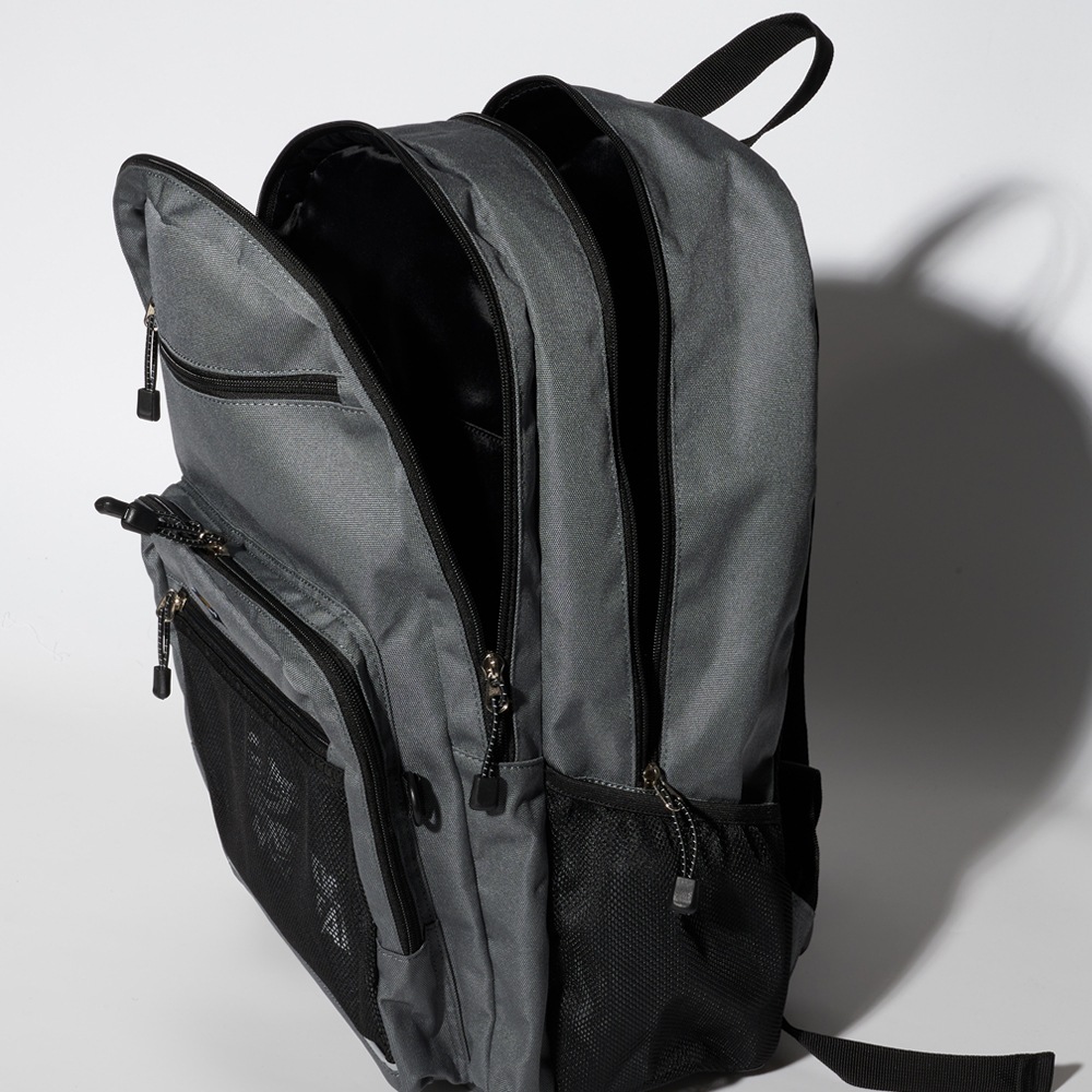 約30Lの大容量なうえ、PCなどを収納するのに便利なクッション入りスリーブや、ペットボトルが入るメッシュ素材のサイドポケット等、その他大小さまざまなポケットが豊富にあるので、こまごましたものもすっきり収納できます。