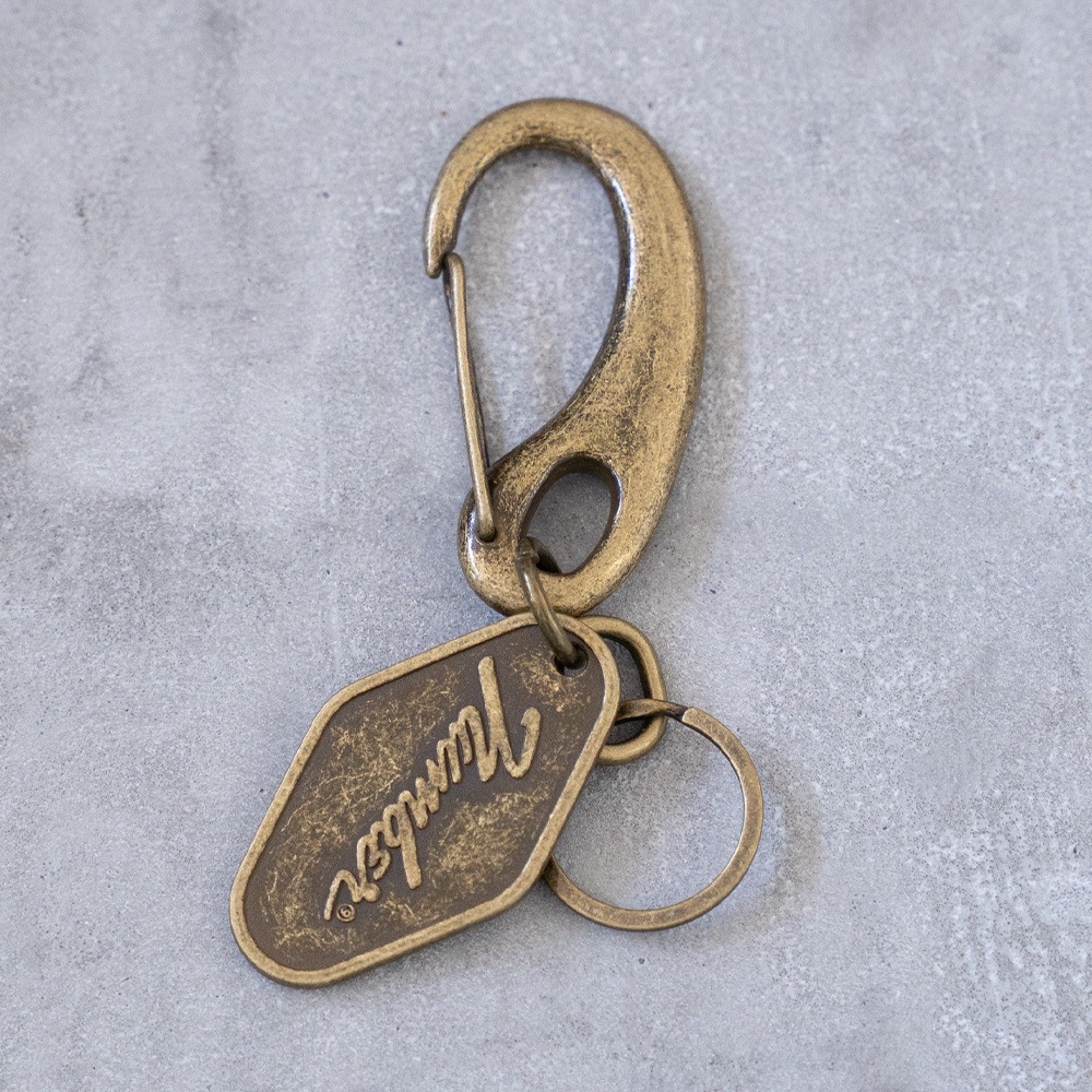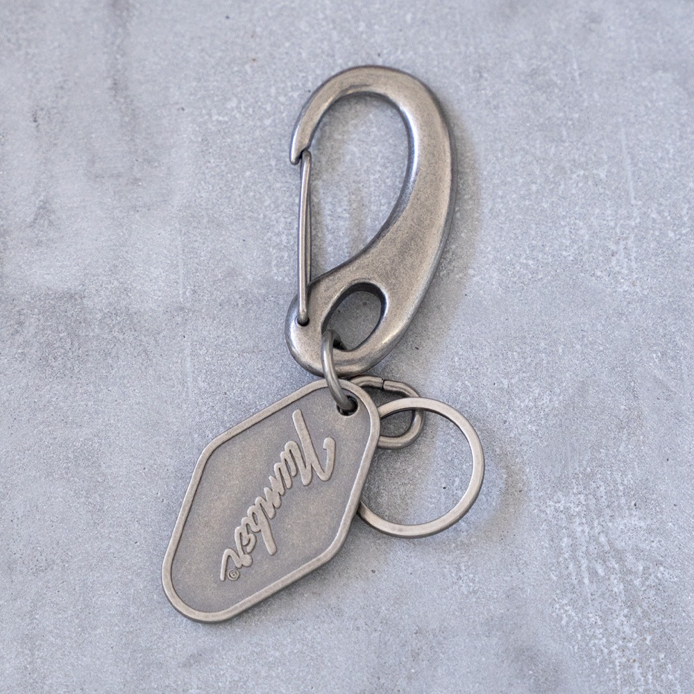 カラビナは少し大きくゴツめなしっかりとしたものをセレクトし、ひし形のプレートをメインのチャームにしています。