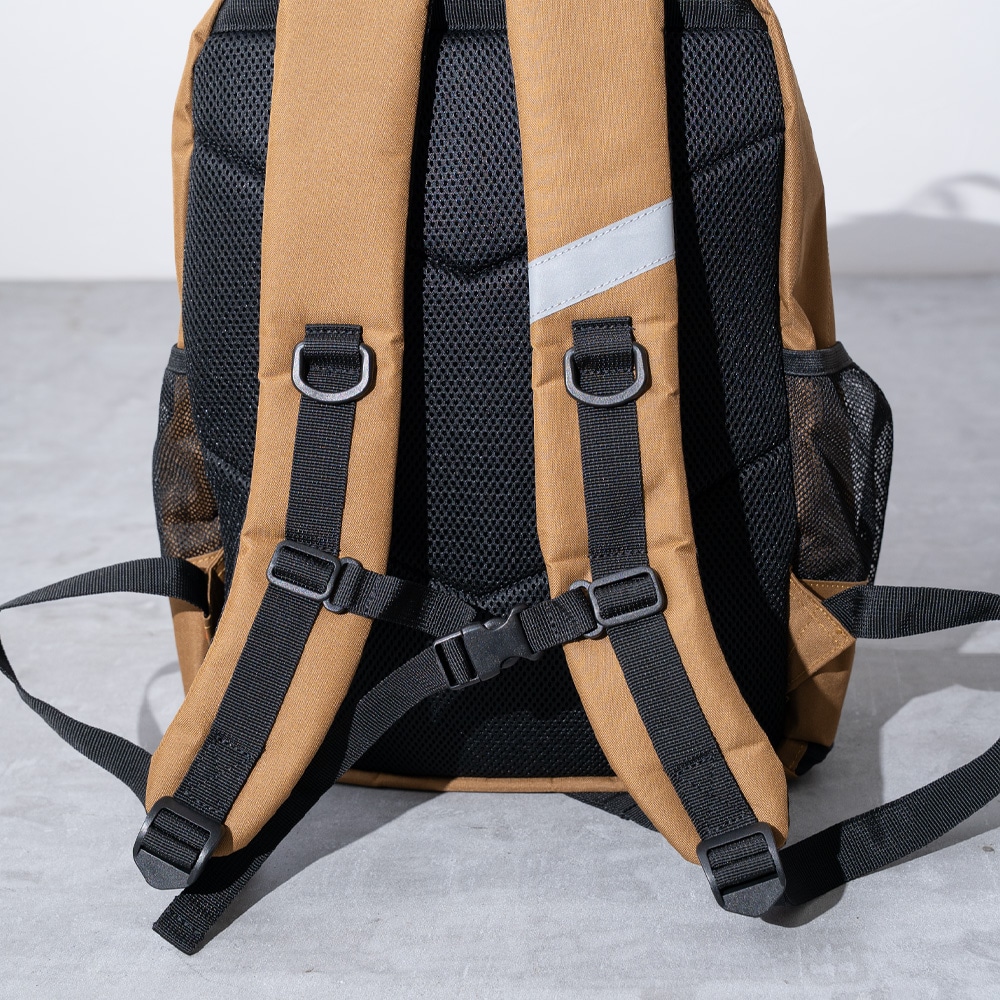デッキを固定可能なストラップのほか、背負ったままアクセス可能なボトムの収納、ドリンクホルダー、リフレクターなどを完備。