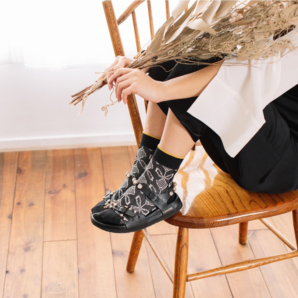 モノトーンの花柄は履き口のカラーがアクセントになって◎