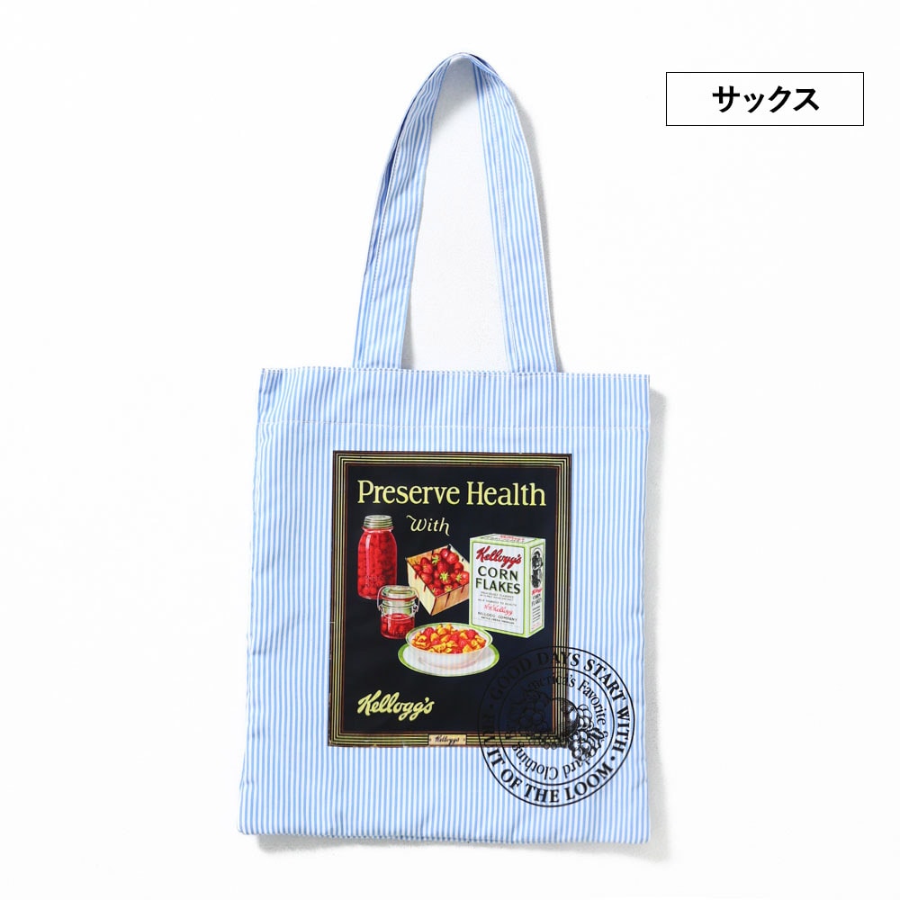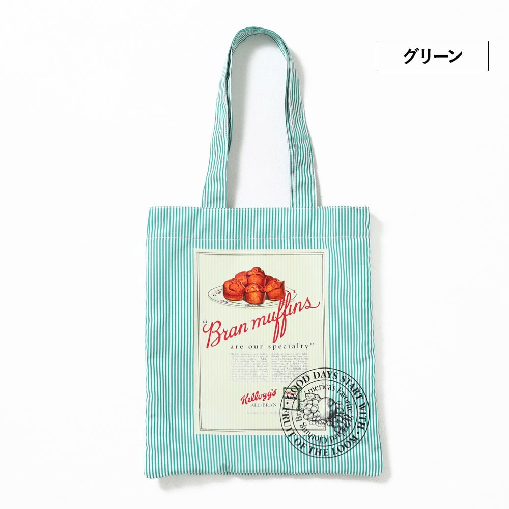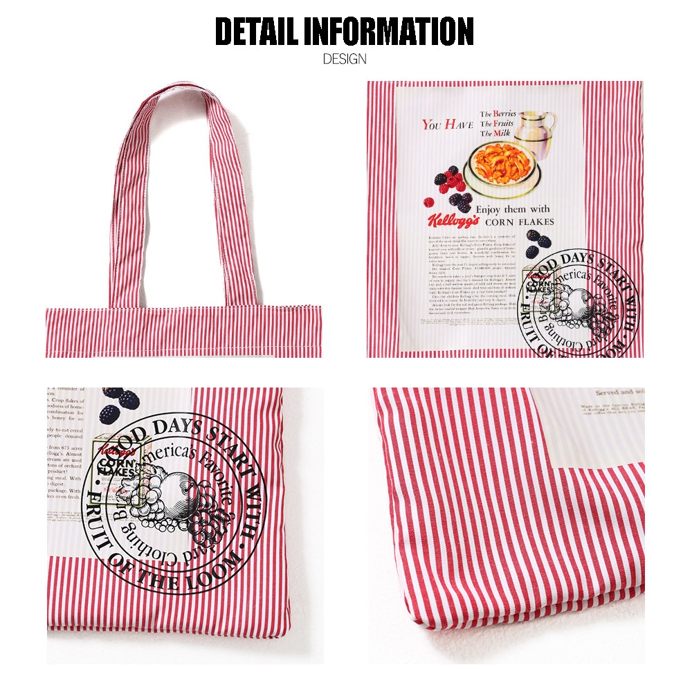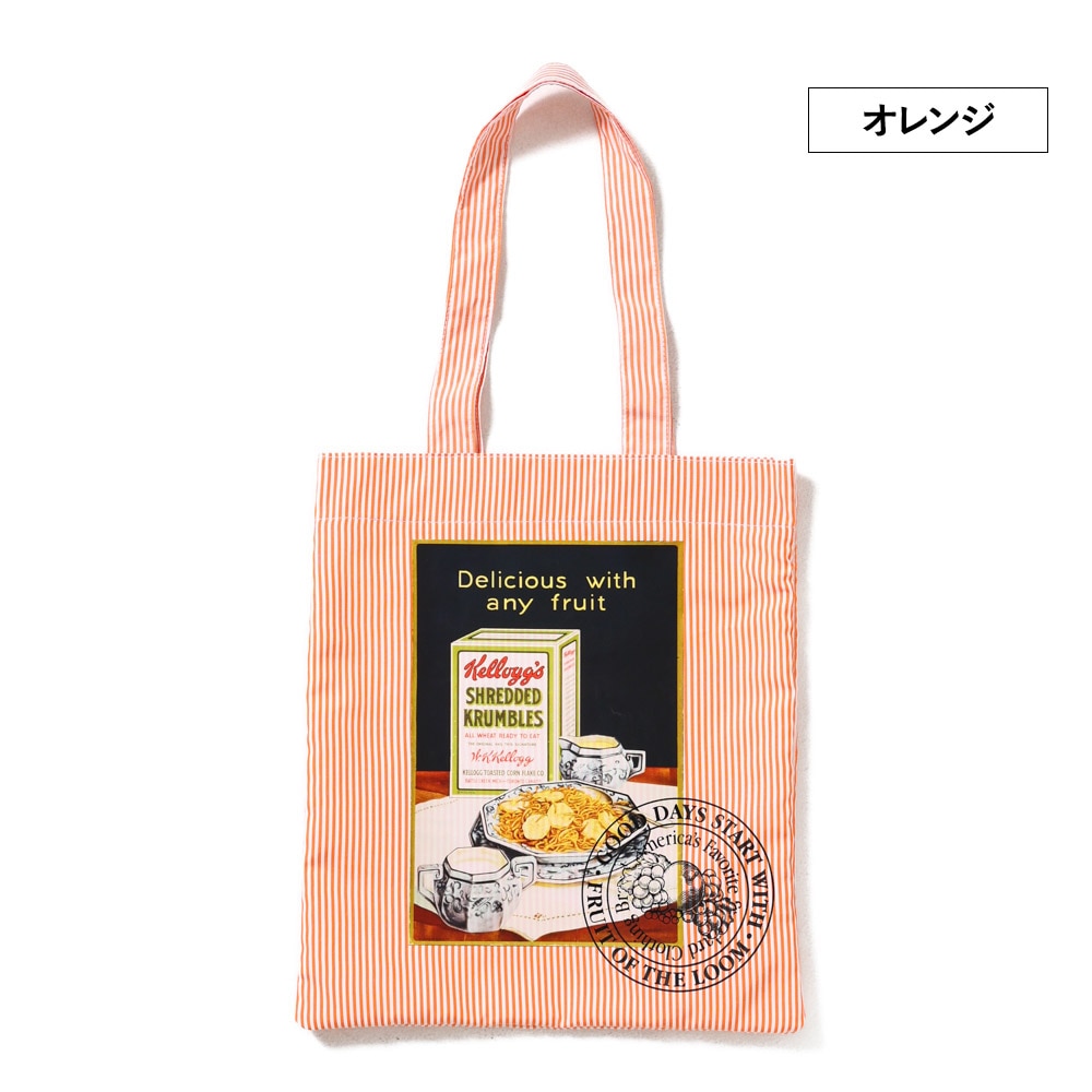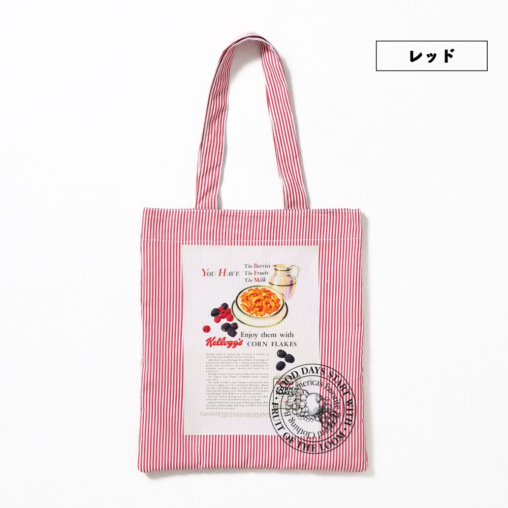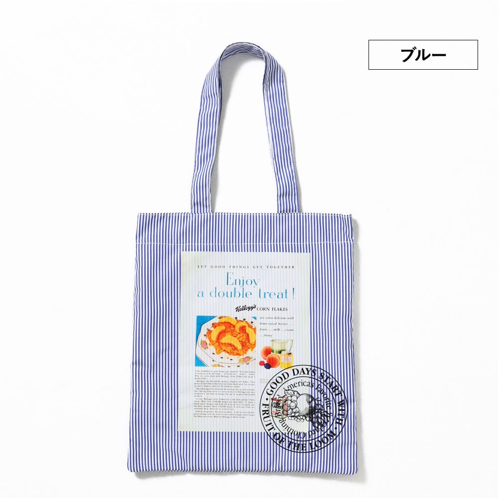 ヴィンテージKellogg’sの広告グラフィックを、キャッチーなストライプ柄に落とし込んだトートバッグ。