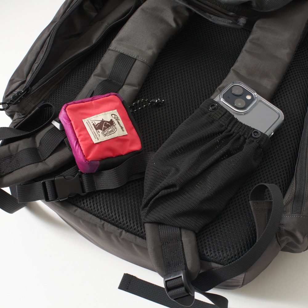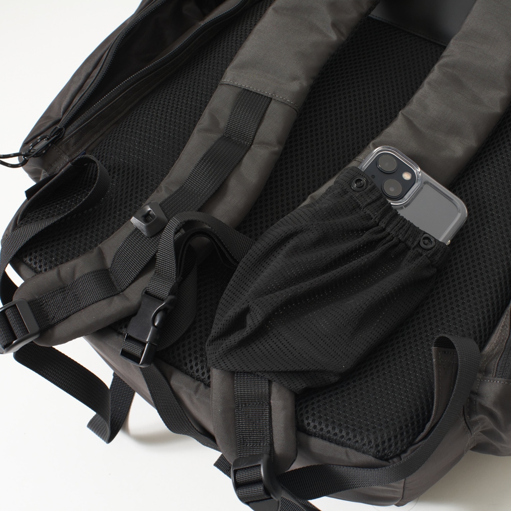 このメッシュポケットは、ファスナーを下側に配置した独自構造。