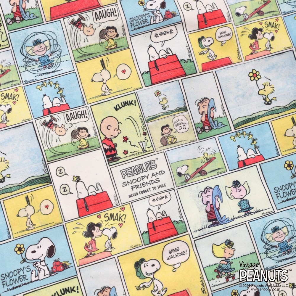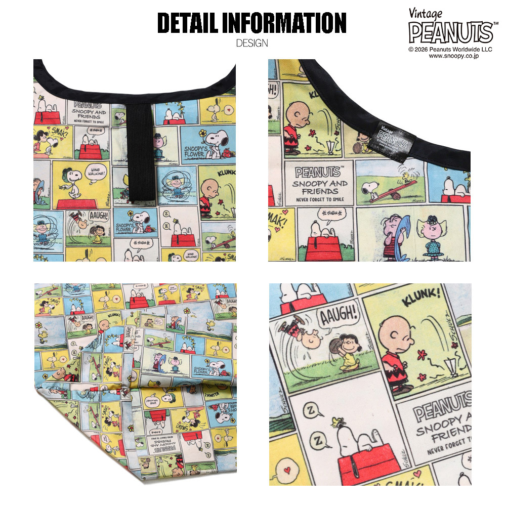 スヌーピーと仲間たちをコミック調に散りばめた総柄デザインが特徴で、日常使いからお買い物シーンまで幅広く活躍するアイテムです。